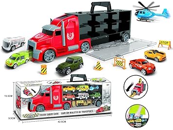 Brigamo Action Spielzeugauto Set Mit Truck Und Integrierter Startrampe Im Lkw Autotransporter Inkl Tragegriff Mit 5 Spielzeugautos Hubschrauber Und